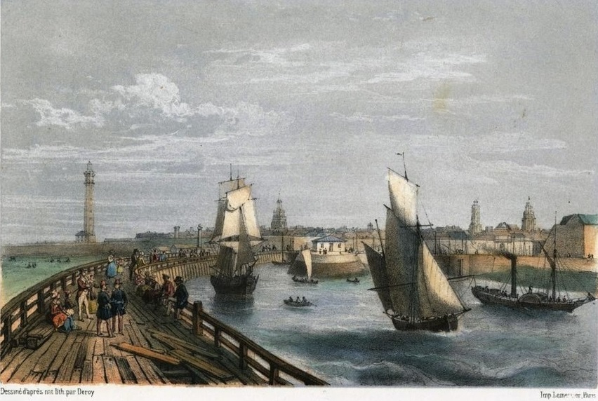 « Calais. Entrée du port », lithographie par Deroy. [1830-1870], Archives départementales du Pas-de-Calais, 4 J 439/94.