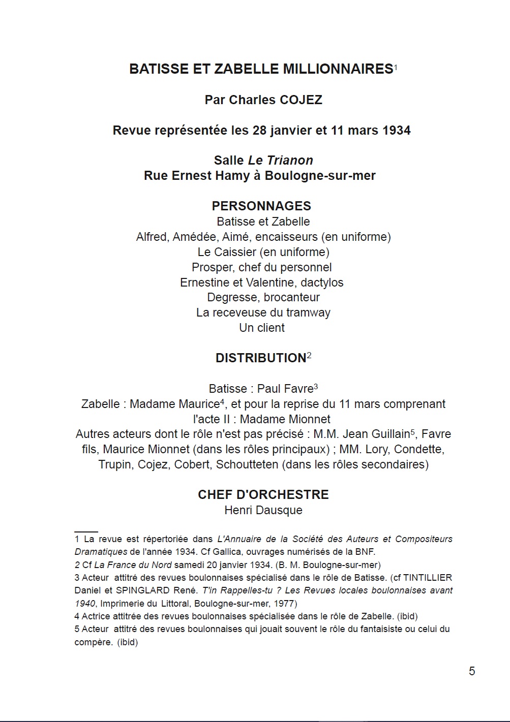 La revue patoisante Batisse et Zabelle Millionnaires a été représentée pour la première fois dans la salle de l’Eden Salon à Boulogne-sur-mer le 28 janvier 1934.